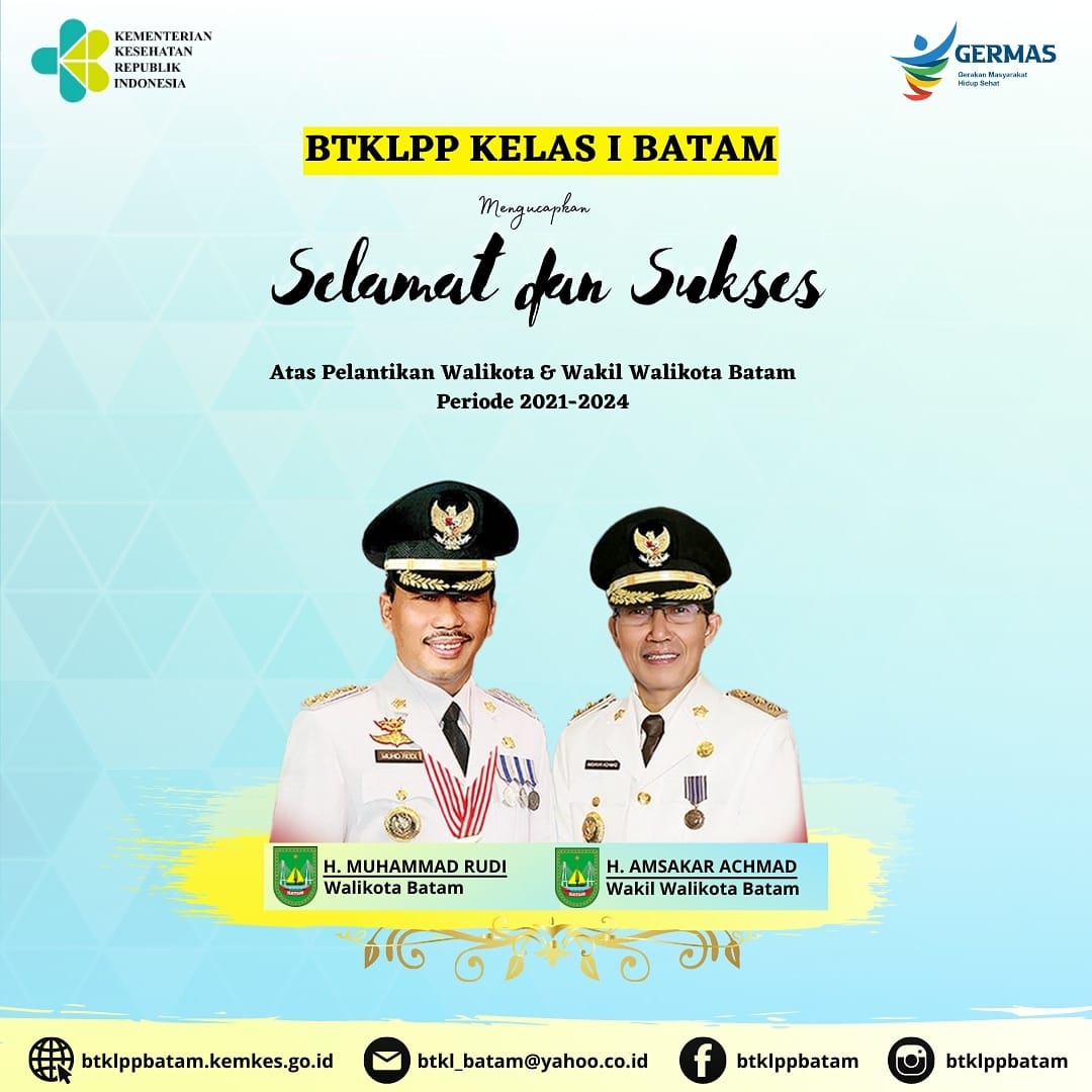 Balai Teknik Kesehatan Lingkungan & Pengendalian Penyakit – BTKLPP Kelas I Batam -mengucapkan- Selamat dan Sukses kepada Bapak H.M Muhammad Rudi & Bapak H. Amsakar Achmad Atas pelantikan Walikota Batam & Wakil Walikota Batam periode 2021-2024 #btklppbatam #batam #walikota #wakilwalikota #kemenkes #ditjenp2p