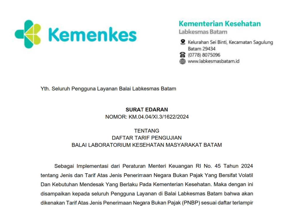 Surat Edaran Tentang Daftar Tarif (PNBP) Pengujian Balai Laboratorium Kesehatan Masyarakat Batam
