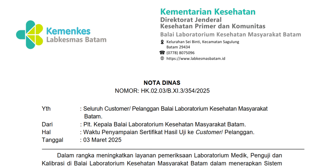 Yang Terhormat Pelanggan Balai Labkesmas Batam, Dalam rangka Pengendalian Gratifikasi di Lingkungan Balai Labkesmas Batam maka dihimbau kepada masyarakat, rekanan dan pengguna layanan di Lingkungan Balai Labkesmas Batam untuk: Demikian informasi ini kami sampaikan. Atas perhatian dan kerjasamanya diucapkan terima kasih. Hormat Kami,Plt. Kepala Balai Labkesmas Batam Zulhirdan Siregar