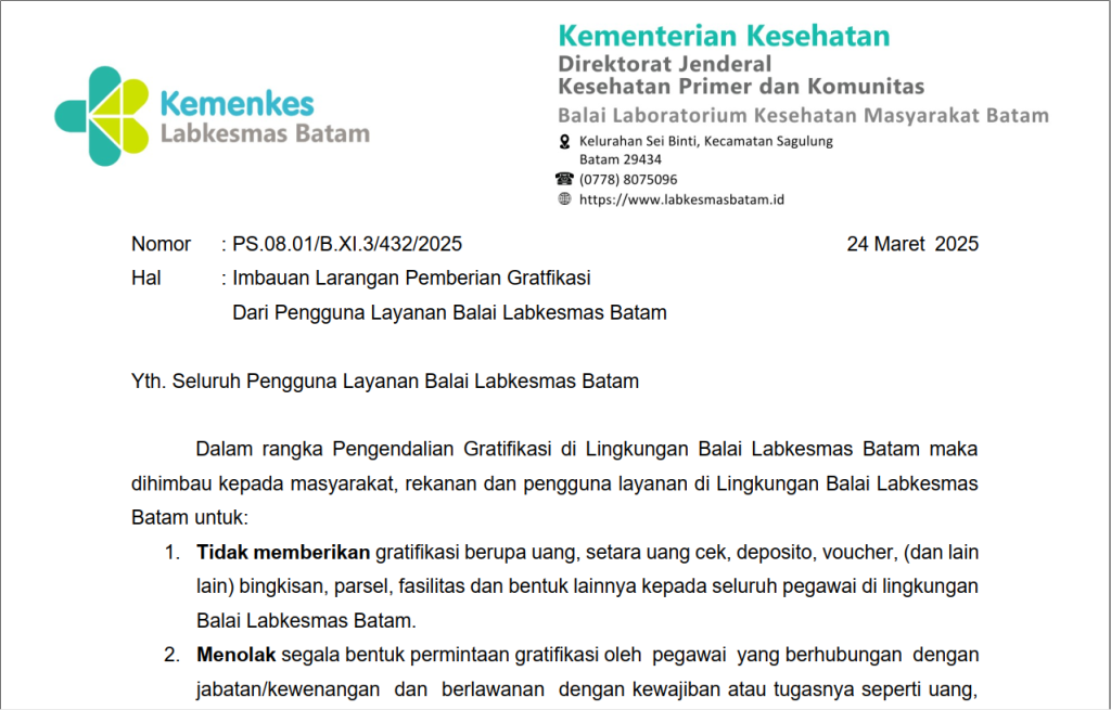 Surat Edaran Tentang Imbauan Larangan Pemberian Gratifikasi Dari Pengguna Layanan Balai Labkesmas Batam